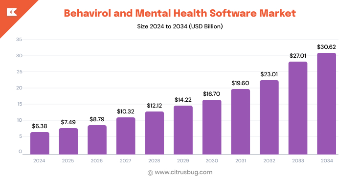 The global behavioral and mental health software market is projected to grow from USD 7.49 billion in 2025 to USD 30.62 billion by 2034, at a CAGR of 16.98%. This growth is fueled by increasing mental health awareness, supportive policies, and widespread adoption of cloud-based solutions.