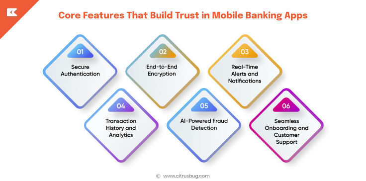 Its main features include safe access, real-time notices, account management, transaction history, fraud detection with the help of AI, and responsive customer service. Transparency and privacy are also significant factors in building trust.